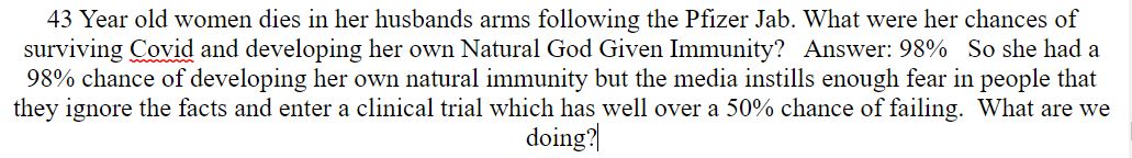50 Year Old Nurse Tech dies following the covid JAB. What were her chances of surviving Covid-19 with no treatment? Answer: 95%. That is with NO treatment. Add in some Ivermectin and Hydroxychloroquine with some zinc, that goes way up. The hydroxychloroquine helps the zinc enter the cells in your body. NO virus can survive in a cell that has adequate zinc. This is why zinc is so very important to take as a supplement. The best zinc is liquid zinc from a company called Vimergy.